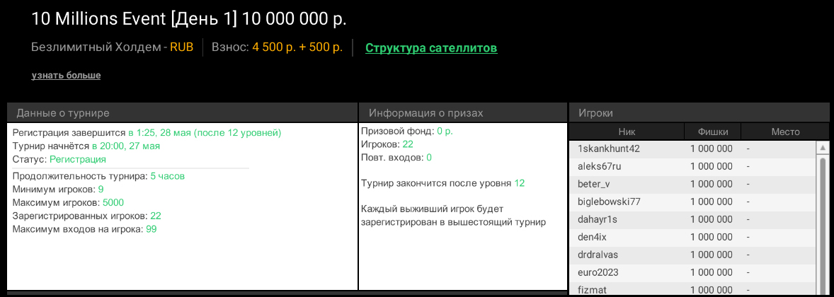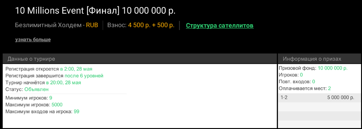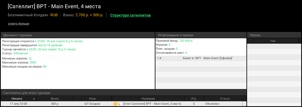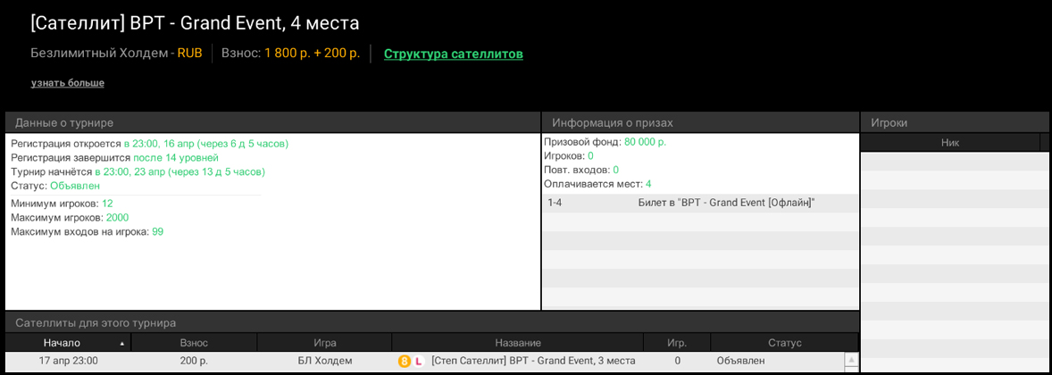 - ₽2К Сателлит с гарантией 4 билета по ₽20К — старт по воскресеньям в 21:00 МСК.