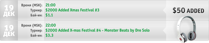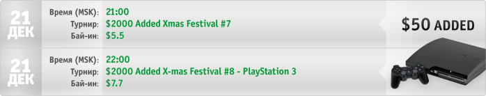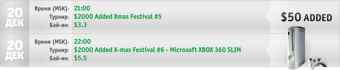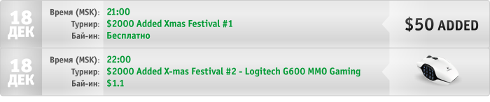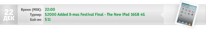 Начнётся все с двух фрироллов, а закончится большим финалом всего за $11 и возможностью подарить себе на Рождество последний iPad 4G. Расписание турниров: