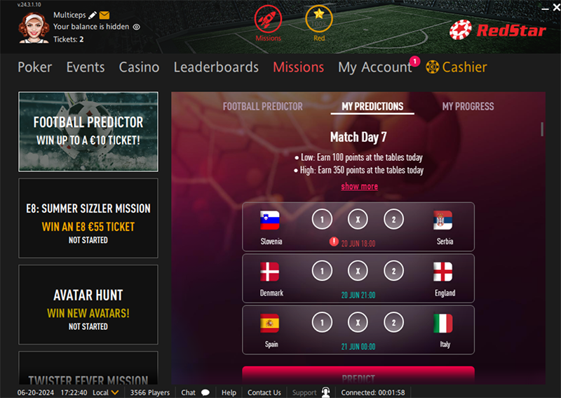 Угадайте 3+ прогнозов в день во время группового этапа Евро-2024 и получите билет в Hat Trick Freeroll €3,000 Gtd, который пройдет 28 июня. Все игроки фриролла попадут в ITM.