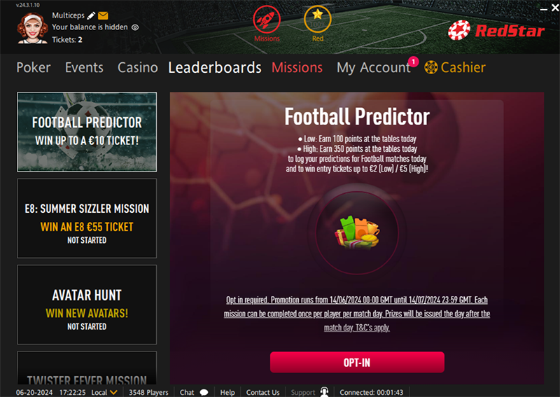 Для участия в акции нужно прожать «Opt In» в разделе Missions и набить определенное количество рейка: