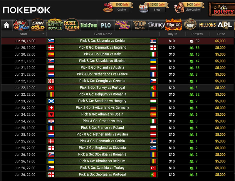 Например, сегодня в 19:00 МСК стартует турнир $10 Pick&Go: Denmark vs England $5K GTD. До начала турнира нужно выбрать, кто победит в матче. Если считаете, что победит Дания, то участвуете в этом турнире за $3,42 (скидка на бай-ин 65,8%). Если Англия — $6,58 (скидка на бай-ин 34,2%).