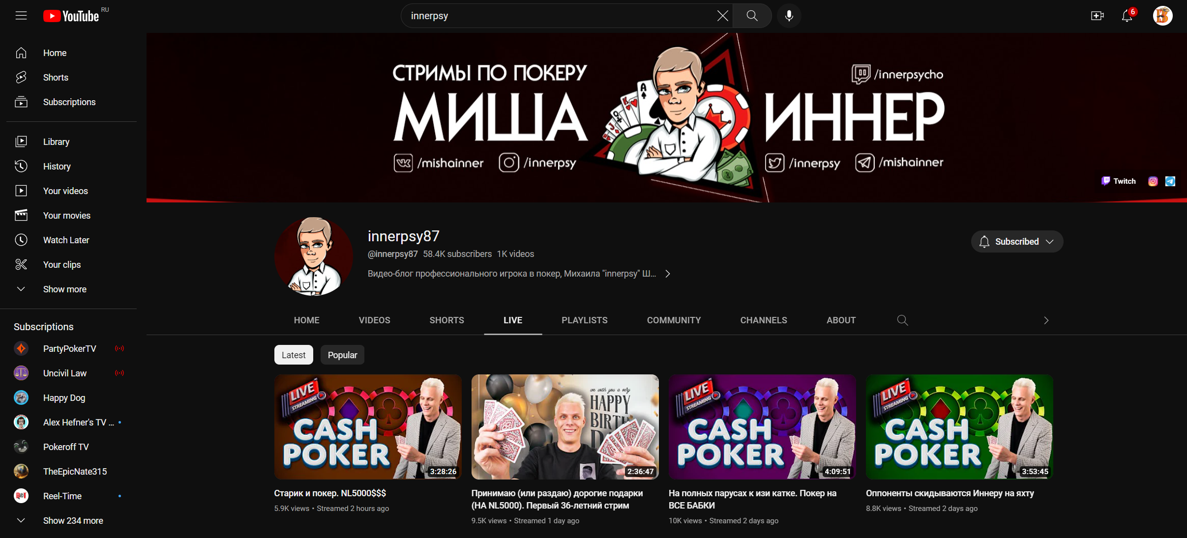 - Амбассадор ПокерОК Михаил «innerpsy» Шаламов — 58,4К подписчиков на Ютубе, 79,1К фолловеров на Твиче — регулярно стримит, выкладывает хайлайты и Shorts;
