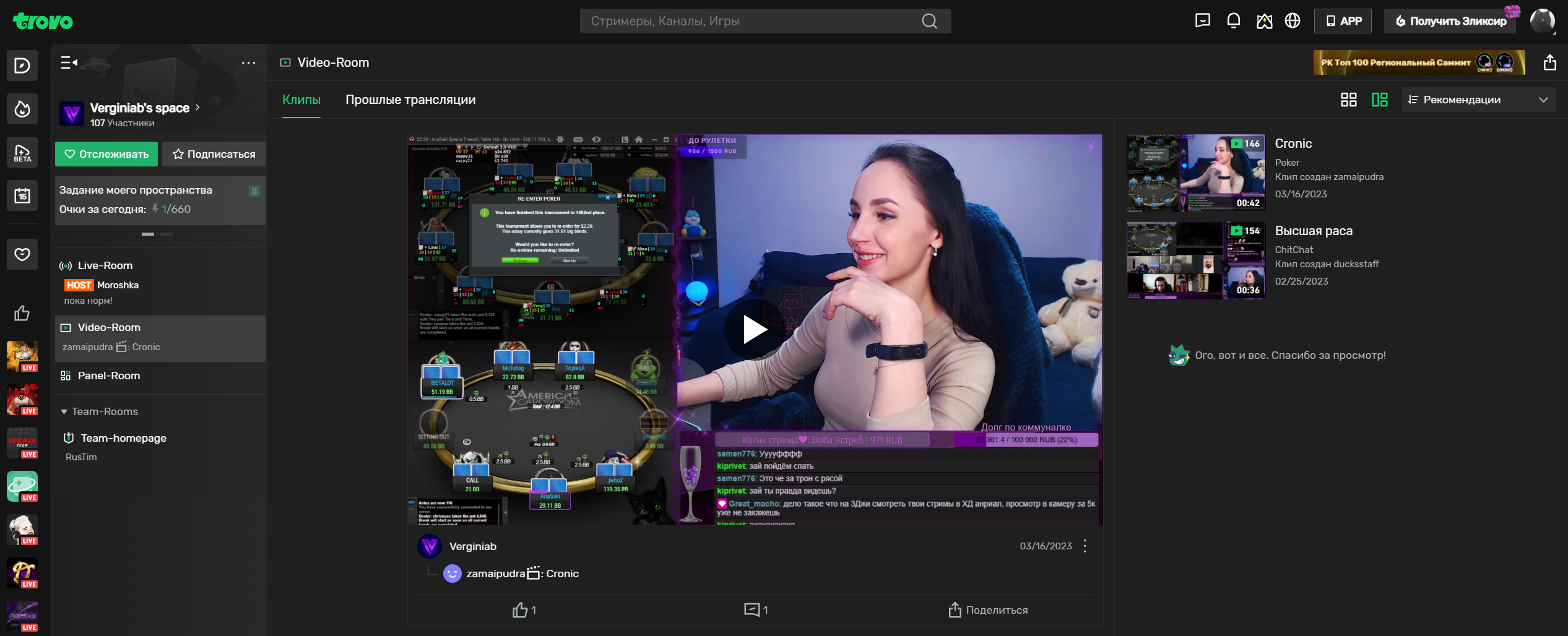 Для примера мы взяли канал покеристки Вергинии «Verginiab» Будик — на Твиче у неё 7,6К фолловеров, а на Trovo.live 107 участников пространства.