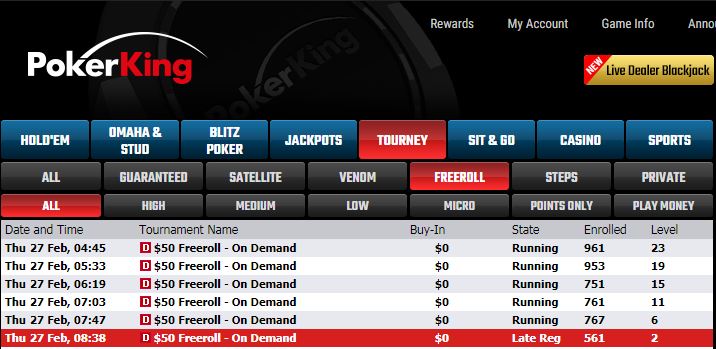 А если у вас нет банкролла и делать депозит вы не хотите, тогда обратите внимание на Фрироллы $50 Freeroll — On Demand на PokerKing. Эти турниры расположены во вкладке «Tourney» — «Freeroll». Турниры запускаются каждые полчаса (всякий раз после закрытия поздней регистрации (30 минут) в последний фриролл в лобби открывается регистрация на новый).