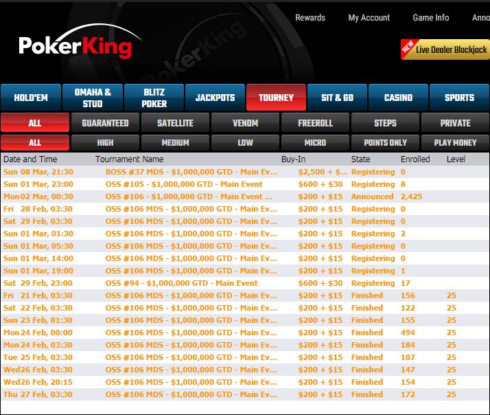 На PokerKing проходят обычные сателлиты на турниры-миллионники. Проще всего найти их через лобби целевого турнира. Для этого перейдите во вкладку «Tourney», в разделе «Filter» введите «1,000,000» и откройте лобби нужно вам турнира.