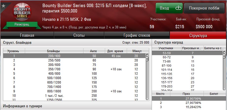 Главное событие Bounty Builder Series с бай-ином $530 и гарантией $2.500.000 стартует 16 февраля в 21:00 (МСК). И если в Main Event PokerStars сделали акцент на более плавной структуре (все уровни по 20 минут), то в большинстве других турниров структура необычная: первые несколько уровней (от 2 до 9) играются дольше, чем оставшиеся уровни. Исключение — турнир Хайроллеров за $5.200, где c 21-го уровня продолжительность увеличивается с 15 до 20 минут.