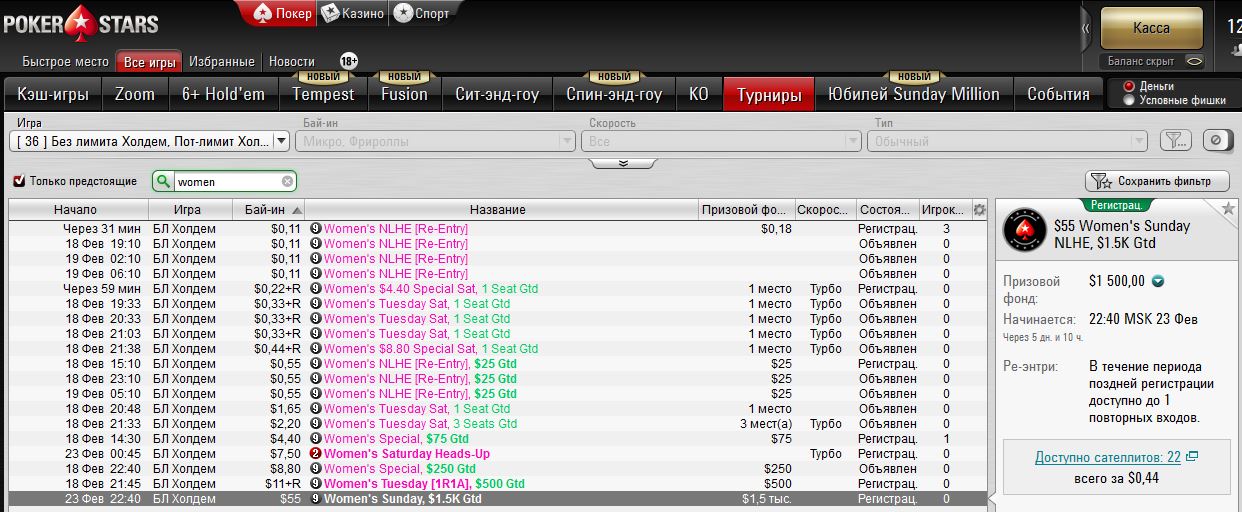 Так как покер — преимущественно мужская игра, организаторы придумали внести в лобби женские турниры. Самой популярной площадкой с турнирам без мужчин — PokerStars. Ежедневно в лобби включены «розовые» турниры с бай-инами от 11 центов.