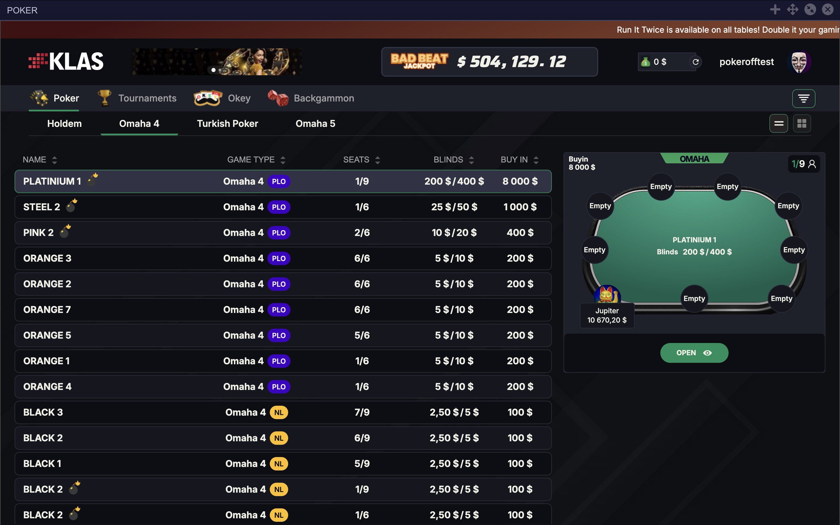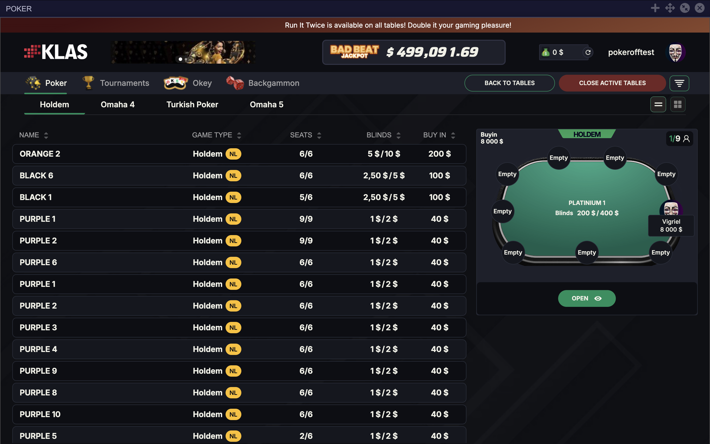 Кеш-игры. Представлены NLHE, PLO, 5-card PLO и турецким покером. Большая часть игры собирается после 19:00 МСК. Есть анонимные столы и столы с бомб-потами.