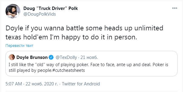 Игра с чартами возмутила легенду покера Дойла Брансона, о чём он написал в Твиттере.