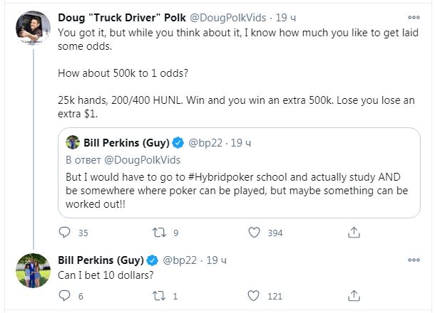 Но никто не отменял сайд-бетов с третьими лицами. Например, Полк поставил $2M с коэффициентом 4:1 на свою победу против Билла Перкинса. В случае выигрыша Перкинс выплатит Полку $500K.