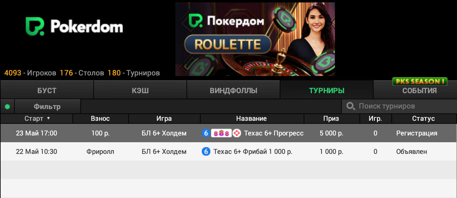 - Остались только два турнира: фрибай каждый день в 10:30 МСК и ₽100 Техас 6+ Прогресс ₽5,000 по четвергам в 17:00 МСК. Крупные турниры по 6+ добавляют на сериях.