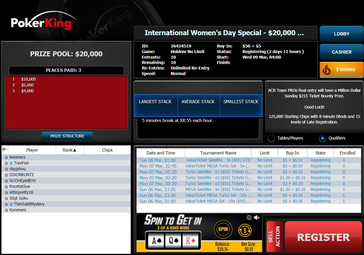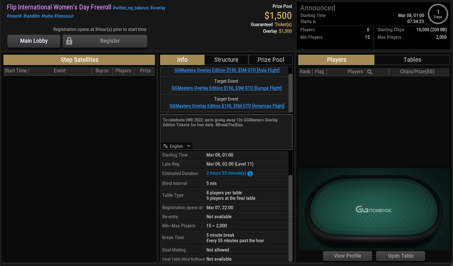 Попасть в турнир можно через сателлиты с бай-инами от $1.40 до $5.50 и гарантиями от 2 до 10 билетов. Их расписание пополняется по мере приближения к дню проведения турнира, найти полный список можно в турнирном лобби $55 International Women’s Day Special $20K Gtd.