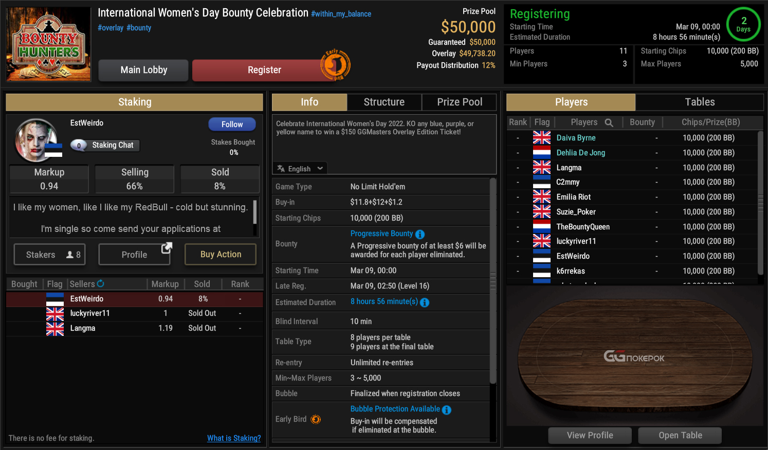 8 марта в 22:00 МСК на GGПОКЕРОК стартует $25 International Women’s Day Bounty Celebration $50K Gtd. Сателлитов для этого турнира нет, но прямой вход доступен для игроков любого пола. Турнир имеет следующую структуру:
