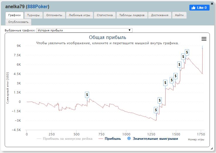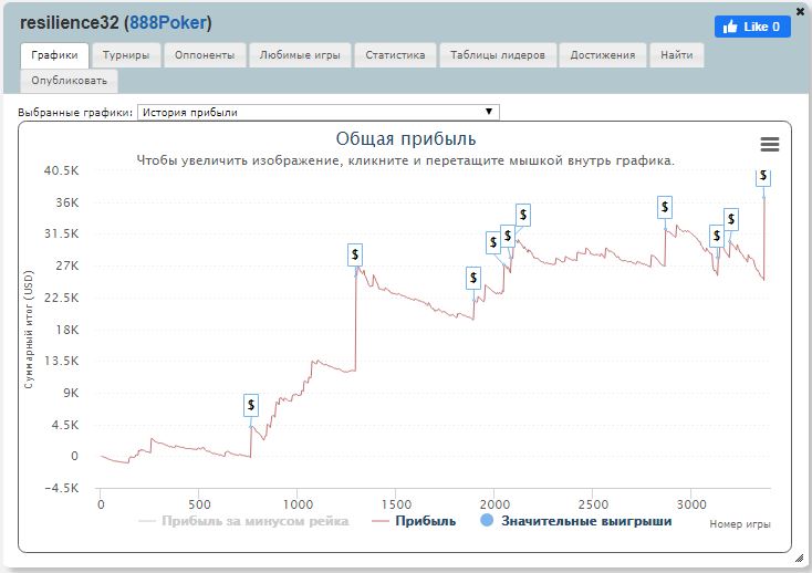 Главный приз $11.993 достался игроку из Германии под ником «resilience32». Это игрок регулярно доезжает в турнирах на 888poker. Он выигрывал турниры серий Xl Eclipse и XL Inferno. Вот его график:
