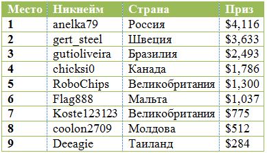 Чемпионом события стал игрок из России под ником «anellka79». В результате дележки ему досталось $4.115, а раннер-апу из Швеции под ником «gert_steel» — $3.633. Интересно, что на 888poker «anellka79» играет с 2011 года, но только за последние полтора года ему удалось резко вывести график в плюс. И теперь кривая профита стремится к отметке в $10.000.