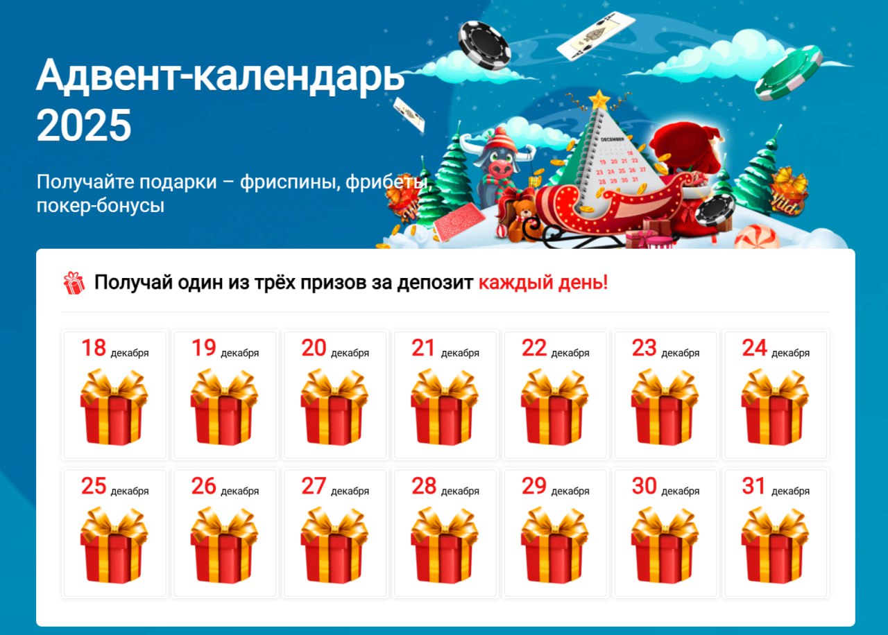 RedStar Poker: предновогодний Advent Calendar для депозиторов и акция Free Blinds Random Rewards для кешевиков