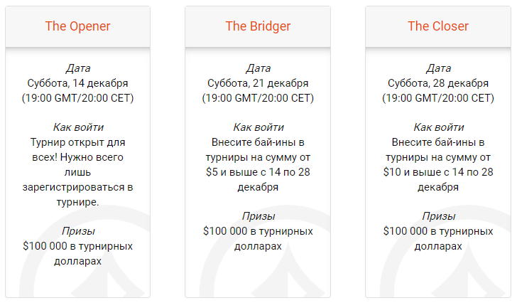 - 21 декабря — турнир с бай-ином $100 (неограниченные re-entry)