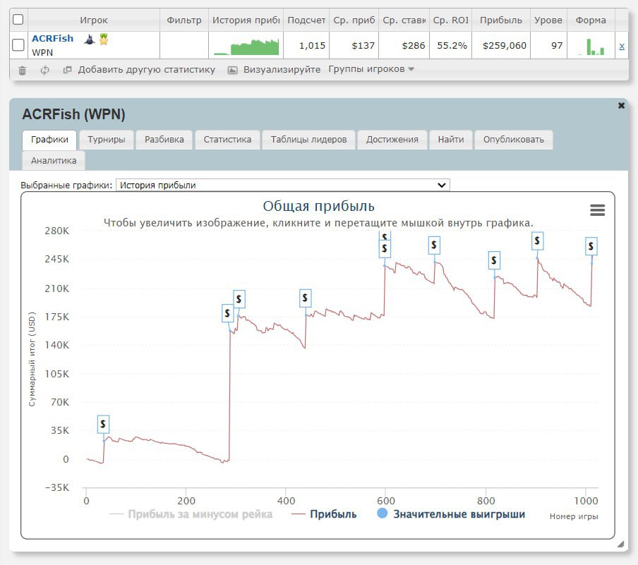 После победы в Lunch High Roller профит ACRFish на PokerKing по данным SharkScope превысил $259K.