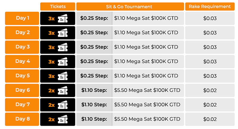 Также в течение 7 дней после депозита игроки получают билеты на саб-сателлиты $109 Sunday Showdown $100K GTD. Для получения билетов нужно сделать по $0.03 и $0.02 в день.