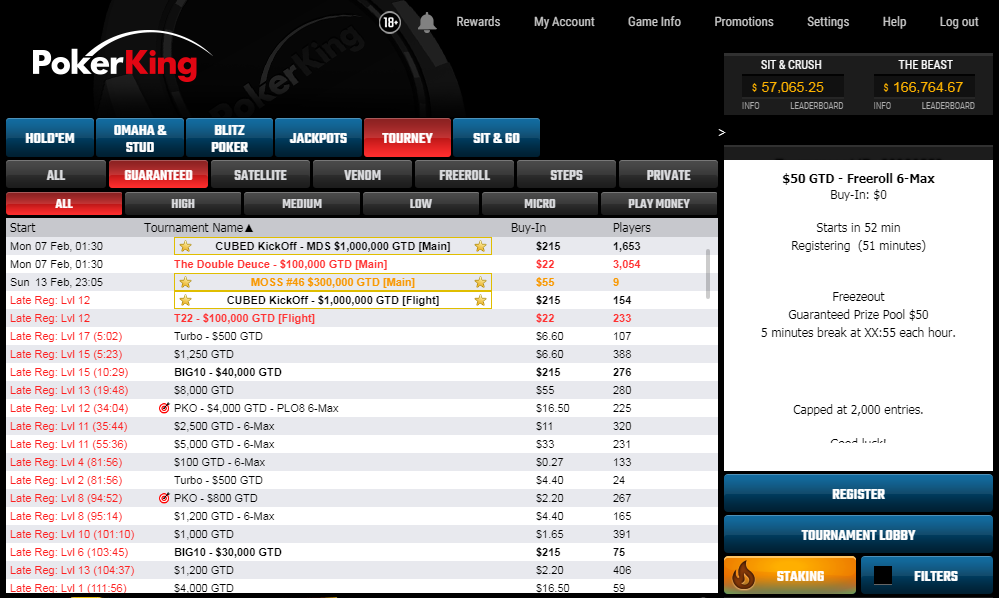- Крупные серии, турниры с гарантией $1M. С 6 февраля по 7 марта на PokerKing будет проходить серия OSS: 200 турниров с общей гарантией $25M. Самые крупные гарантии заявлены в многодневных событиях: