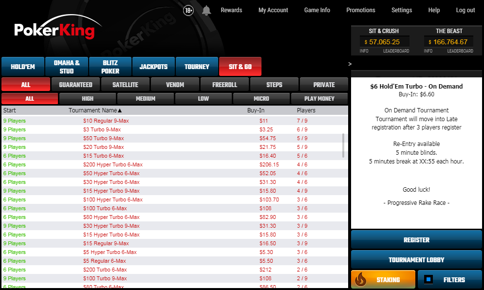 Также на PokerKing есть рейк-гонка The Beast. Участвуют все столы, кроме HU. За каждые $0,02 рейка (Weighted Contributed Rake) игроку начисляется 1 очко.