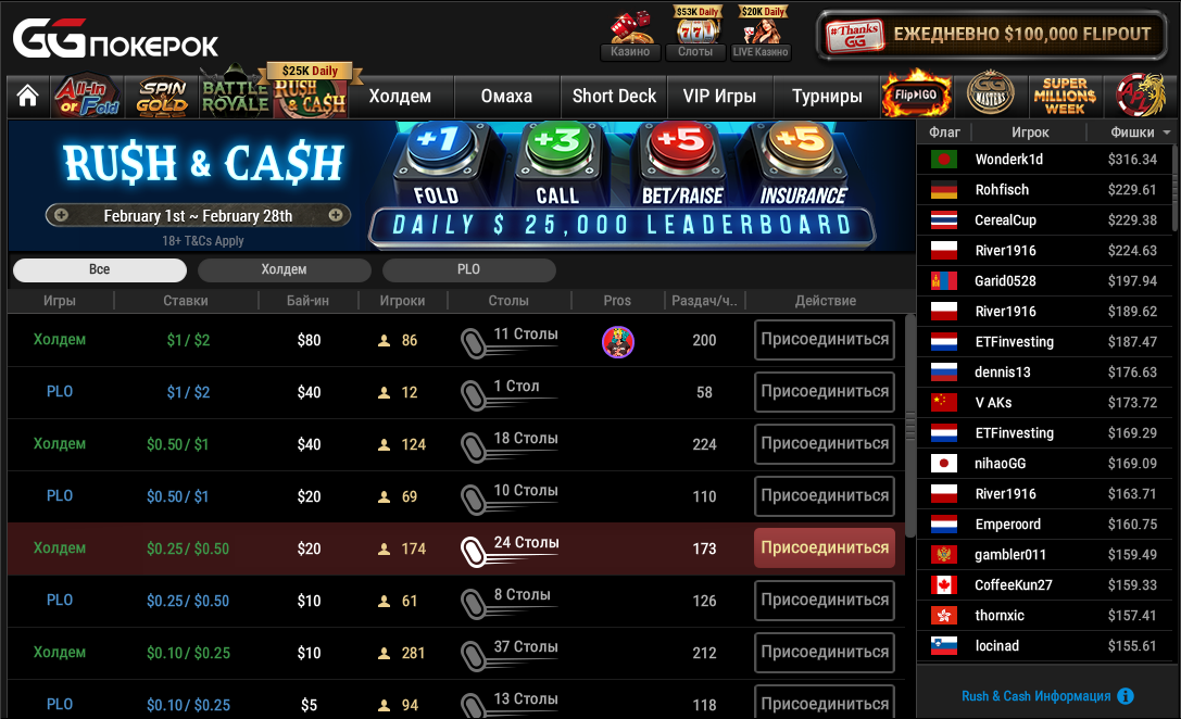 На GGПОКЕРОК действует гонка для игроков быстрого покера Rush&Cash. Гонка разделена на две дисциплины (Холдем и Омаха) и семь лимитов. Очки начисляются за действия (максимально 20 очков за раздачу):