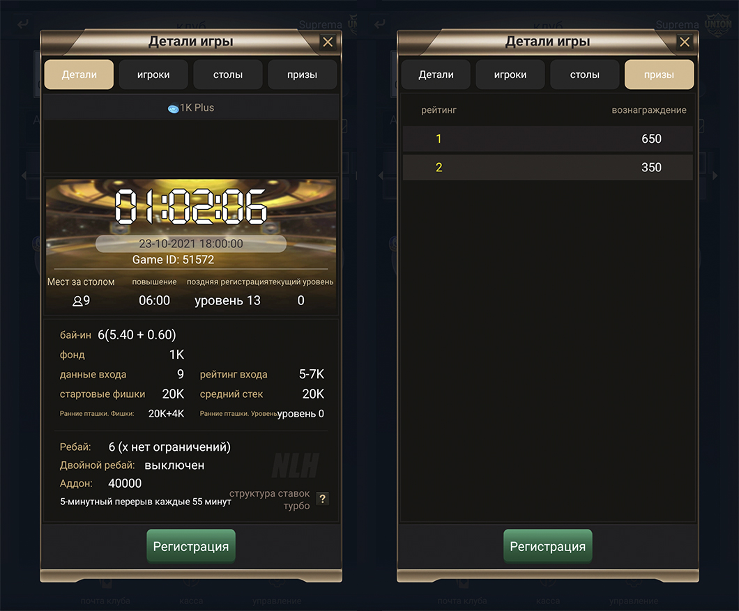 Отдельно отмечу удобный дизайн турнирного лобби — вся информация в нём представлена однозначно и понятно, меня порадовало, что перевод на русский язык логичный и уточнены важные моменты: время до старта, бай-ин и рейк, размер призового фонда, количество ребаев, распределение призов, список участников и прочее.