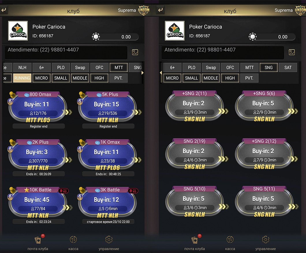 Хотя людей в Suprema Poker играет много, до вечера они не особо интересуются турнирами. Так, днём я ни разу не видела, чтобы игрался хотя бы одни Sit&Go или Спин, а когда открыла вкладку МТТ в клубе Poker Carioca в 16:00 МСК, там был всего один турнир по NLH за R$11. Однако, к 19:00 МСК в расписании появилось и начало заполняться больше 20 МТТ по NLH, PLO и PLO5 с бай-инам от R$3 до R$199 и гарантиями от R$500 до R$1M, а в SNG стали доступны и активно заполнялись турниры за R$2, R$5 и R$11 на 6 и 9 человек.