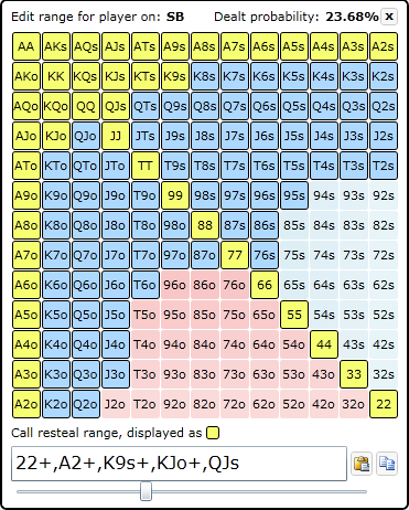 В данном случае голубым цветом отмечены руки, которые есть в диапазоне рейза, а желтым цветом мы выделяем те, с которыми оппонент сделает колл нашего алл-ина. Эти 2 диапазона необходимо редактировать отдельно друг от друга. Снизу доступны кнопки вставки и копирования из буфера обмена, помимо того можно выделять весь диапазон комбинацией клавиш CTRL+A, а вставку и копирование осуществлять с помощью привычных CTRL+C / CTRL+V.