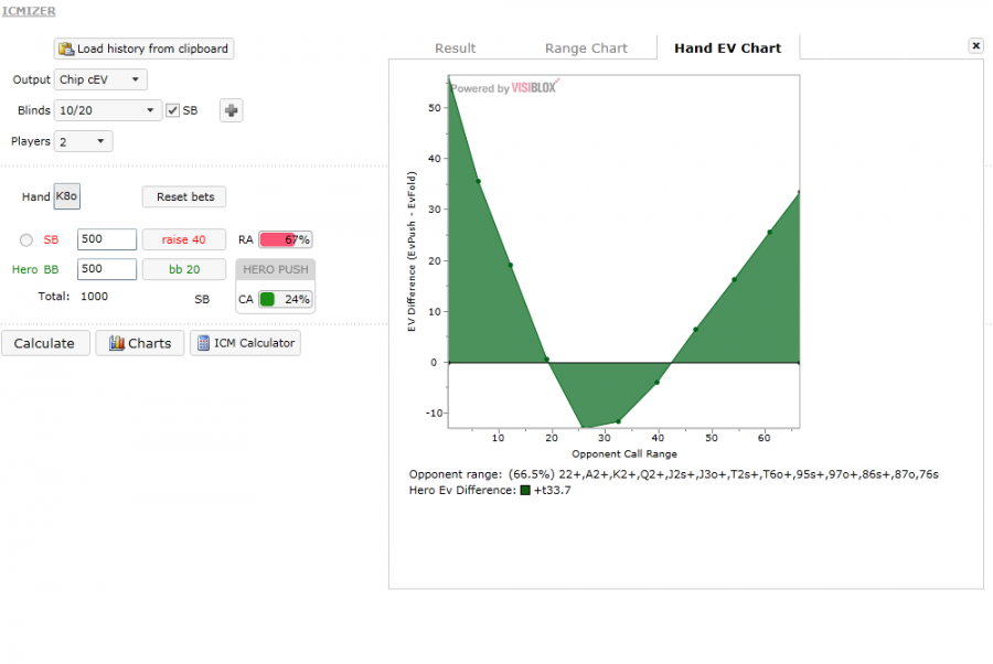 Помимо того, что ICMIZER позволяет узнать EV рестила всех рук, для анализа данной ситуации доступны еще 2 возможности. Предположим мы знаем диапазон рейза игрока, и обдумываем рестил с рукой K8o. Нас интересует, с каким диапазоном оппонент должен коллить, чтобы рестил был для нас выгоден. В этом случае мы можем проанализировать график ЕВ рук (Hand EV Chart)