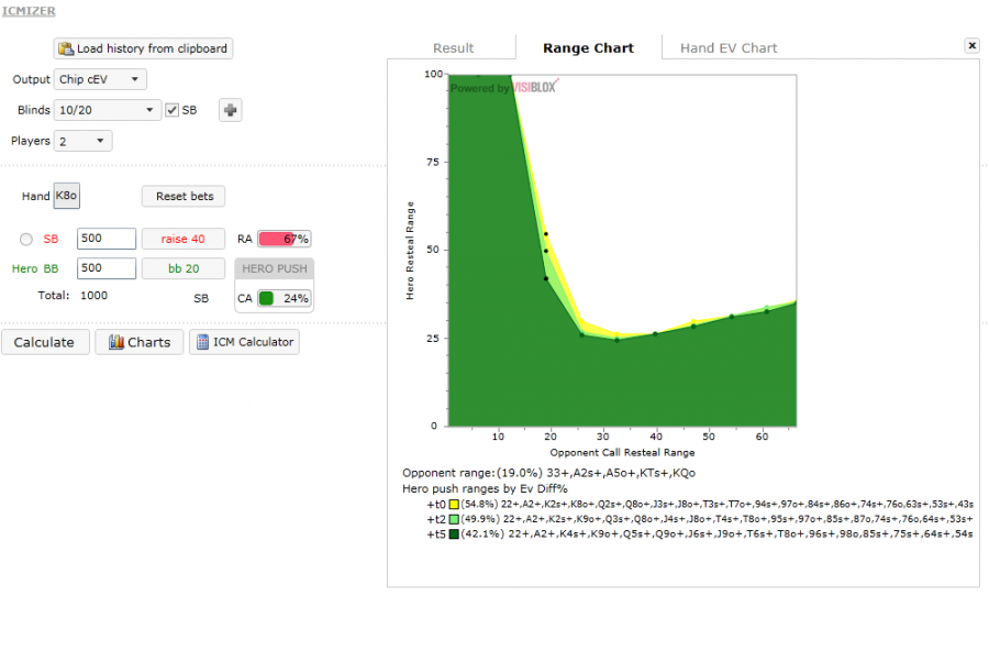 Помимо всего в ICMIZER можно загружать руки непосредственно из покерного клиента, и анализировать множество различных турнирых ситуаций, но данный обзор посвящен конкретно рестилам с большого блайнда в игре один на один.