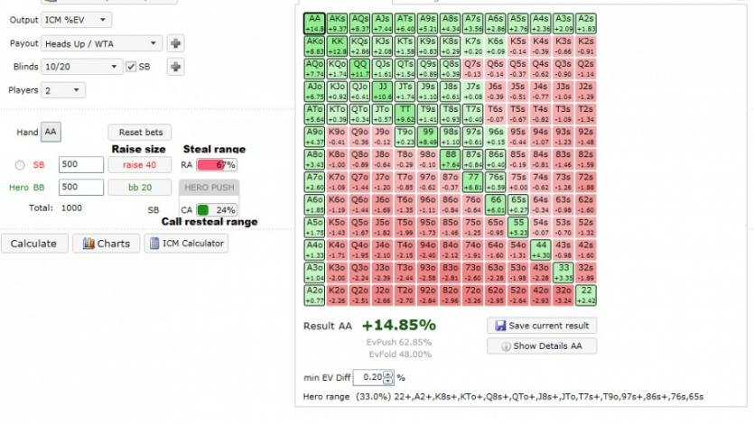 Таблица с результатами, я надеюсь, говорит сама за себя, более зеленый цвет означает большее EV, чем красный. Если вы хотите узнать весь диапазон рук, с которыми пуш имеет, например, математическое ожидание +0.30% призового пула, вы можете изменить значение min diff % на интересующее. Удовлетворяющий этому значению диапазон будет отображен ниже (Hero range). Его можно выделять и копировать, используя мышь и сочетание клавиш CTRL+C.