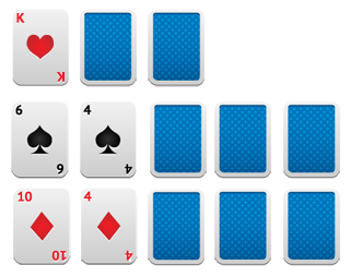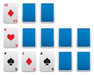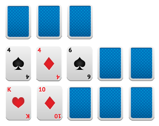 Данная стратегия даёт вам шанс собрать 5 кушей роялти за пару десяток на верхней линии (не забываем, что роялти даются вам независимо от того, выиграли вы эту линию или нет). Также у вас будет 2 пары на нижней линии, чтобы покрыть более сильные пары на средней и верхней линии. Ну и наконец, бэкдорный фулхаус не так уж и плохо. Если вы видите, что ваш оппонент скорее всего зафолит эту раздачу, то можно сыграть более скромно и просто оставить старшие карты на средней и верхней линии.