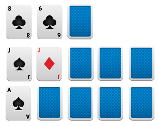 Данная расстановка крайне рисковая, так как вам нужно покрыть JJ в миде. Вашей главной задачей является скидывать на нижнюю линию все карты старше J и собрать из них пару. Большинство людей фокусируют своё внимание на роялти с нижней линии, а это можно использовать в своих целях. В таком раскладе нас больше всего интересует верхняя и средняя линия, так как если мы ловим 6 или 8, то не только, скорее всего, выигрываем верхнюю линию, но и получаем хоть какие-то роялти.