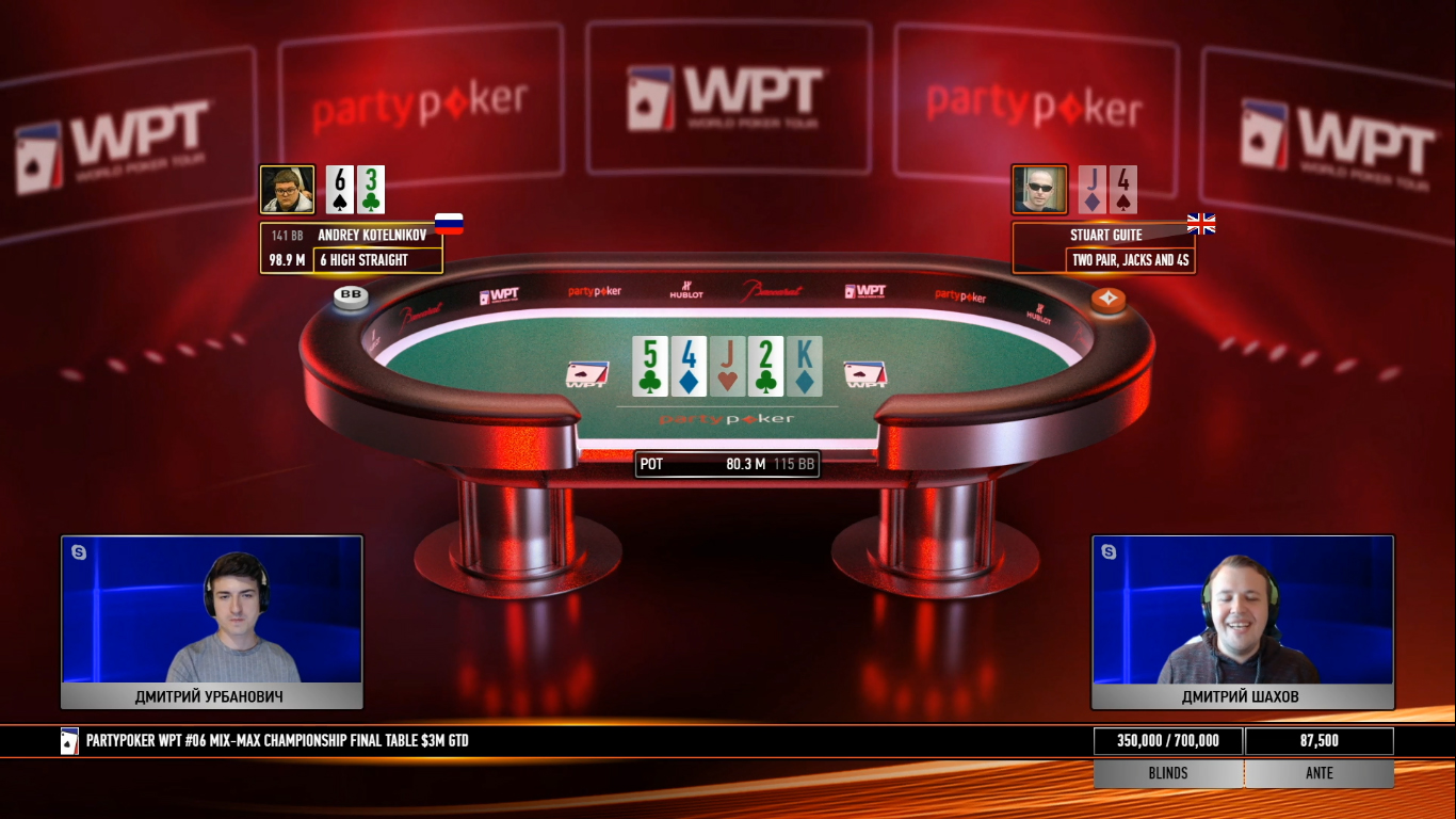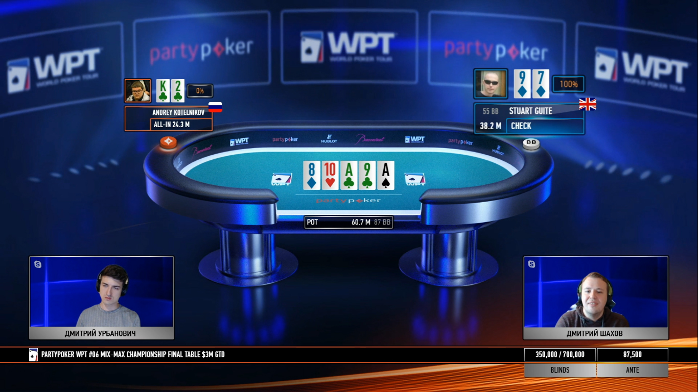 В финальной раздаче Андрею Котельникову раздали стрит, а Стюарту две пары, выкинуть которые он не смог.