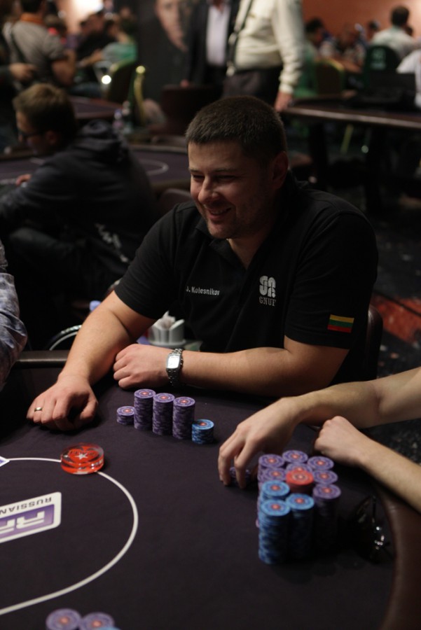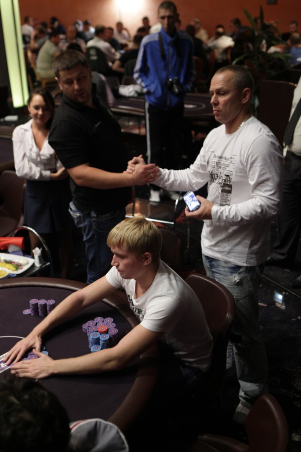 Юрий принимает поздравления с попаданием в призовую зону от Рикардаса Вимериса, а Пономарев загребает фишки.