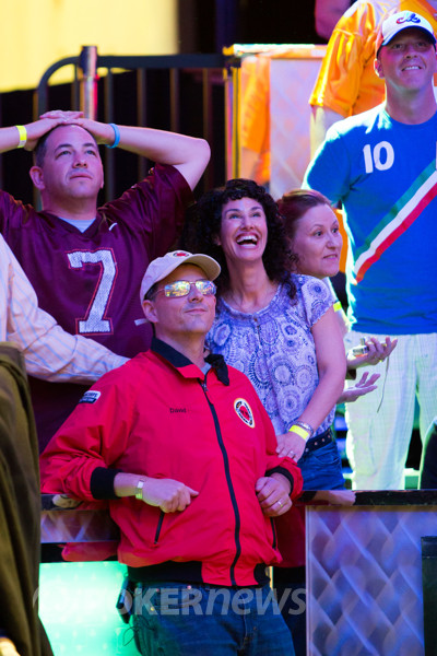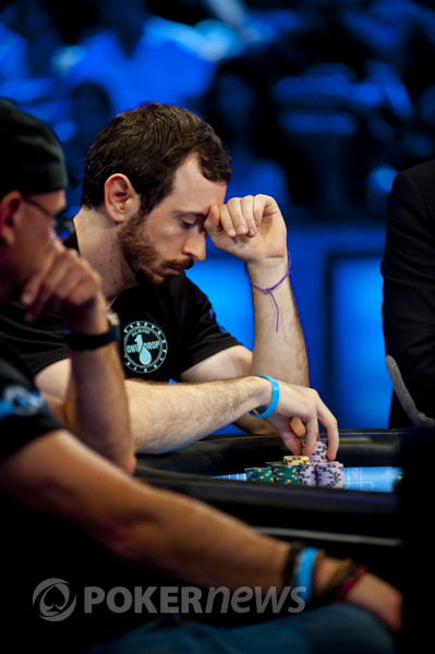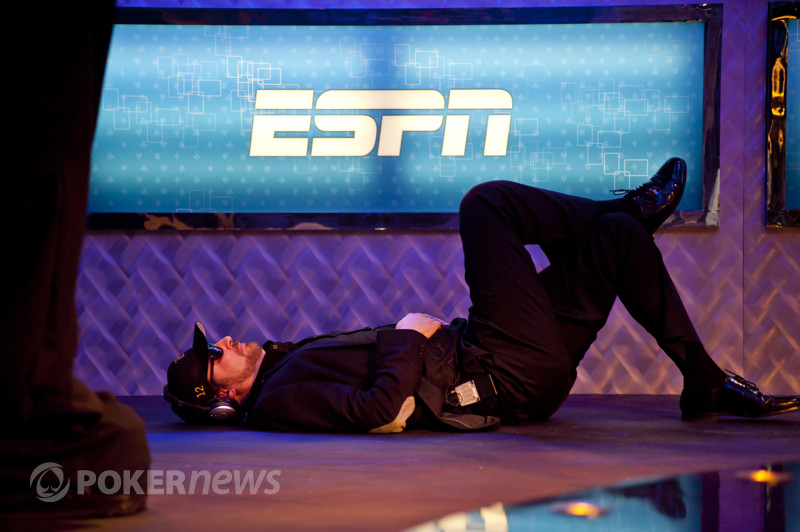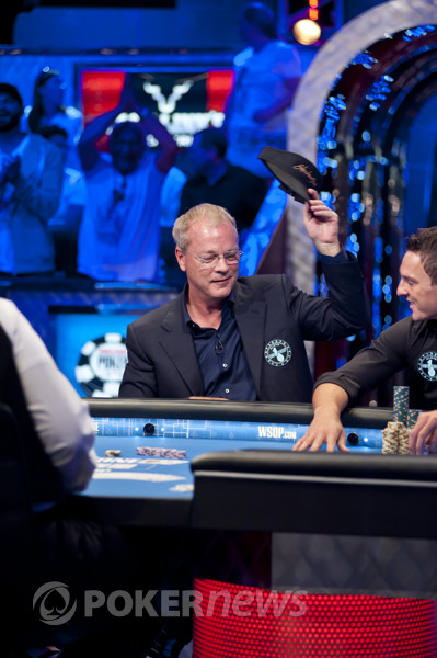 Спустя буквально пару раздач из борьбы за 18 миллионов долларов выбыл скандально известный Фил Хельмут, который, судя по статистике, играл за финалкой со VPIP'ом примерно 8%, выжидая подходящие для себя ситуации. Пару раз ему сдавали отличные флопы, но он своими не совсем понятными действиями получал лишь фолды от оппонентов. Например, он сделал лид с KQ на доске KQx без флаш-дро в одного соперника, который тут же выбросил свою мелкую карманку. Ну и тому подобные вещи. Видимо, сказалась усталость в ожидании ну хоть какой-нибудь руки.