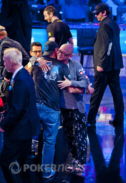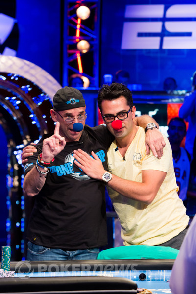 Обнявшись словно закадычные друзья и нацепив клоунские «носы», Антонио и Ги принялись подкалывать друг-друга ещё до флопа: Эсфандиари просил дилера сдать туза «один лишь раз», а владелец Цирка «дю Солей», в свою очередь, начал молить о даме сразу после того, как на тёрне пришёл король, сделавший руку Антонио явным фаворитом в этой раздаче. К несчастью для француза, ривером вышел бланк и ему пришлось покинуть финальный стол с выигрышем $1,834,666.