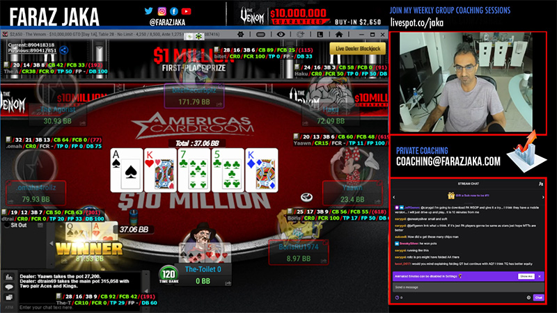 Покер-про, создатель собственного рума в прошлом Фараз «The-Toilet 0» Джака (Faraz Jaka) подрубил стрим, внедрил три бай-ина, но во второй день так и не перешёл. Говорит, будет пробовать ещё в воскресенье, правда, без эфира.