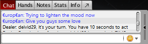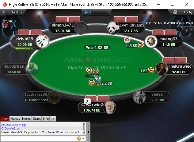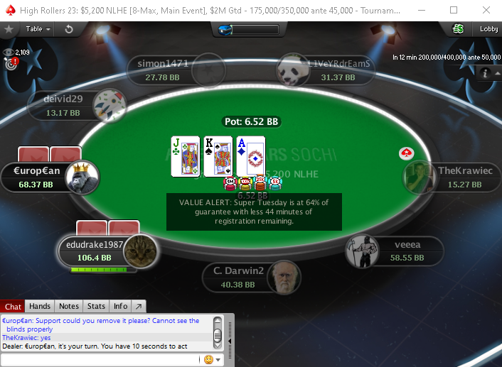 В то же время проходил Super Tuesday, об оверлее которого каждые две минуты сообщал рекламный баннер от PokerStars. В какой-то момент он просто остался на столе, чем закрыл обзор и мешал игре. Игроки просили в чате, чтобы его убрали, так как не видно ставки. Помог решить проблему «C.Darwin2», он посоветовал перезапустить стол. Так и получилось — проблема разрешилась.