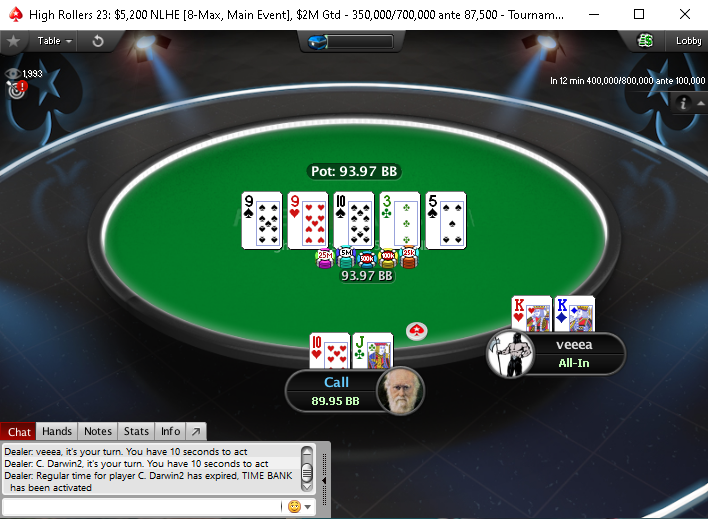 . «C.Darwin2» ставит половину пота, «veeea» пушит. «C.Darwin2» коллирует и показывает две пары с рукой 9
