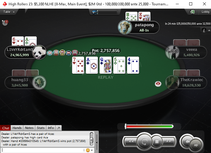 Так как коротких стеков уже ни у кого не было, hand-for-hand перед финалкой длился довольно долго. Исправил эту ситуацию профессиональный игрок из Канады «L1VeYRdrEamS», выбив игрока с ником «patatong». Последний пошёл в олл-ин с первой позиции.