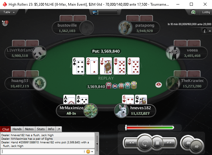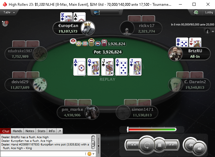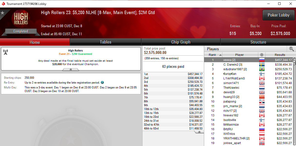 Ну, а главное же событие серии — High Rollers 23 [8-max, Main Event] с бай-ином $5,200 выиграл Артём «veeea» Веженков, получив за первое место $457,344.