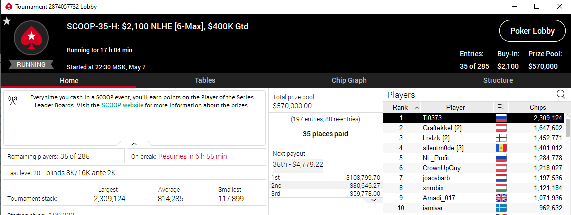 Сегодня вечером у Филатова также будет солидный шанс побороться за $108,799 в турнире SCOOP-35-H: $2100 NLHE [6-Max], где на начало второго игрового дня у него будет 5-ый стек. На первом месте по фишкам там, кстати, идёт Глеб «Ti0373» Тремзин.