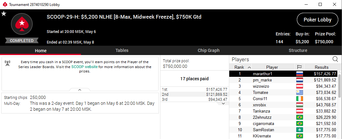Спустя три дня Артур выиграл ещё один турнир SCOOP-29-H: $5200 NLHE [8-Max, Midweek Freeze]. Неудивительно, что и за этой финалкой было немало звёзд онлайн МТТ, но больше всех выделялся легенда SCOOP — Джанлука «Tankanza» Сперанза (Gianluca Speranza).