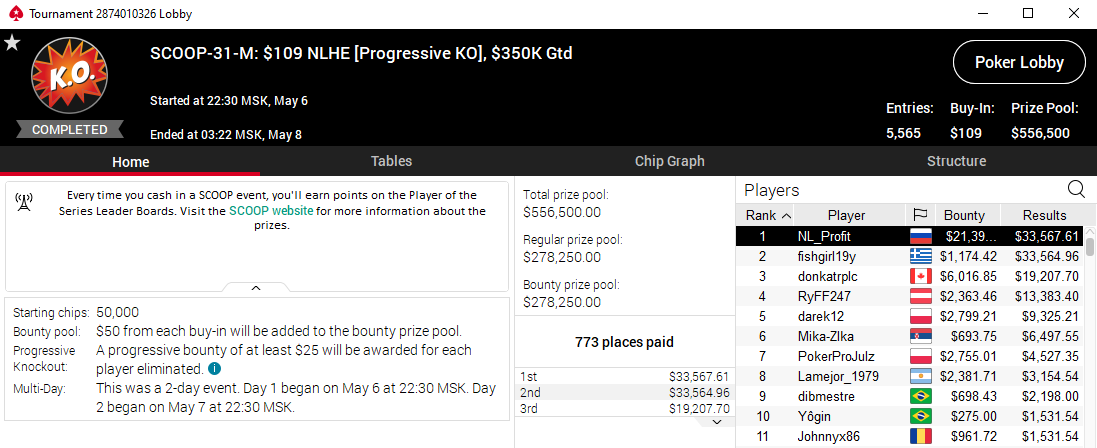 Профессионал команды partypoker Анатолий «NL_Profit» Филатов (Anatoly Filatov) поддерживает связь с фанатами не на покерных площадках, а в своём инстаграме (76,3 тыс подписчиков). Оттуда мы узнали, что вчера он выиграл турнир SCOOP-31-M: $109 NLHE [PKO].