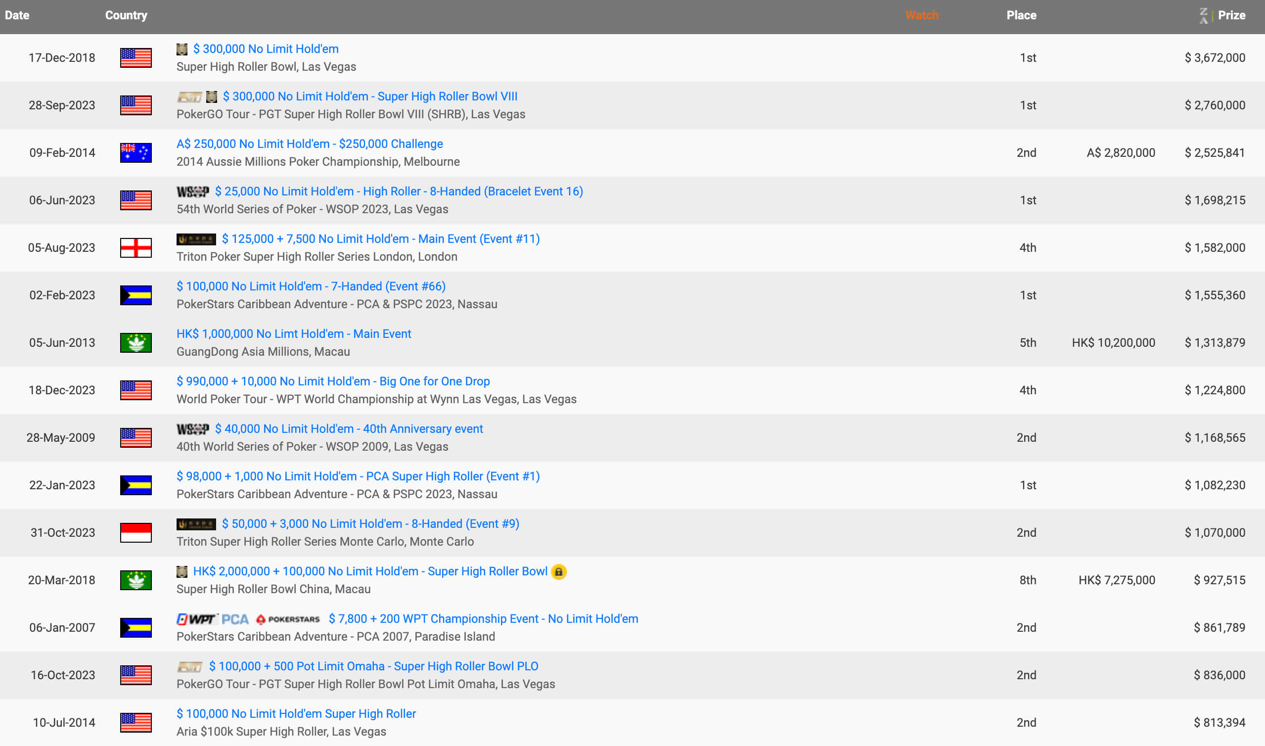 Всего в живых турнирах Айзек Хэкстон оформил $46,856,382 призовых (топ-8 рейтинга All Time Money List). Вот его лучшие результаты за всё время:
