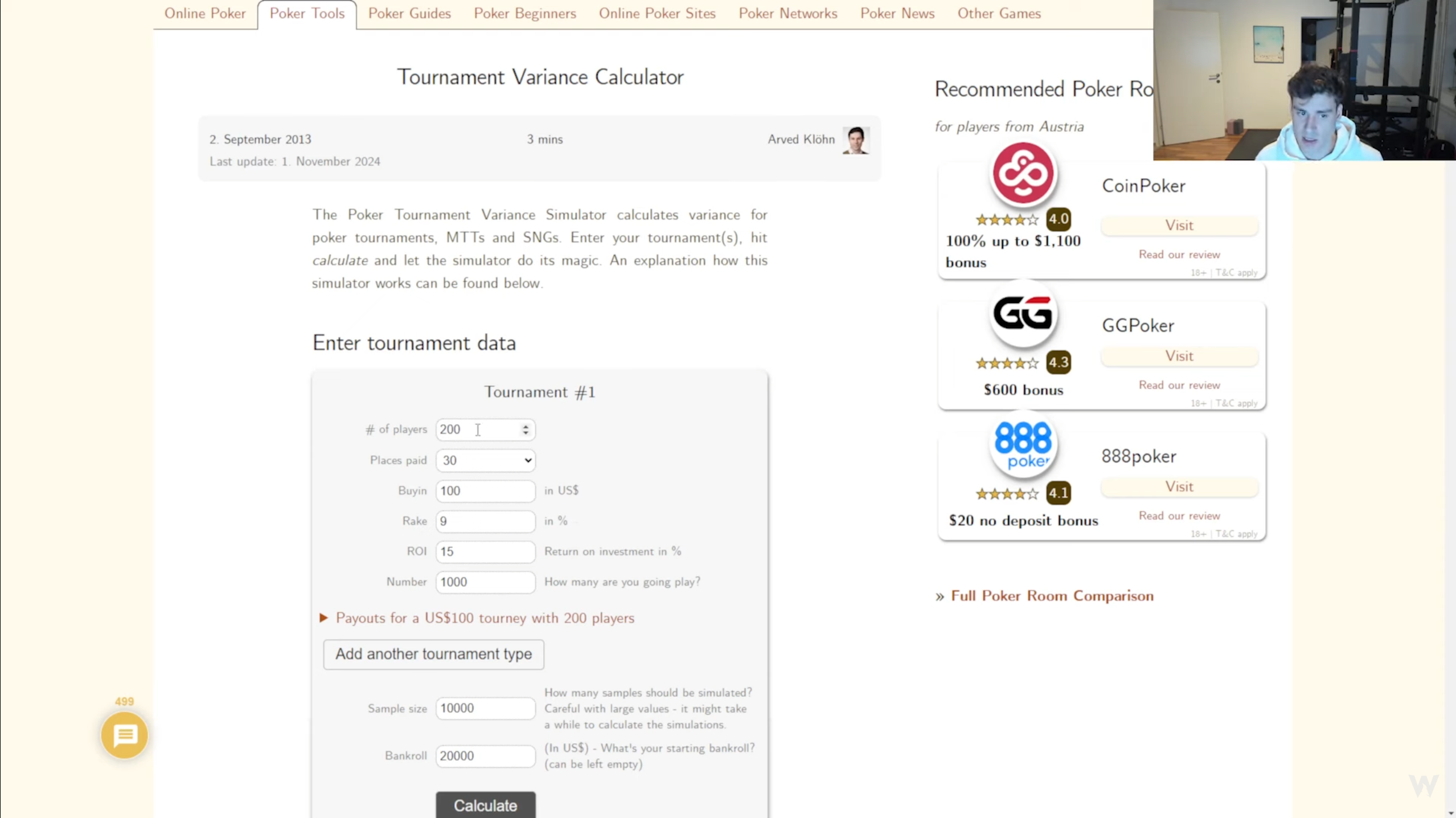 Чтобы разобраться с рисками, Мануэль рекомендует научиться пользоваться любым калькулятором дисперсии для турниров (Tournament Variance Calculator). Сам он обращается к бесплатному калькулятору от PrimeDope.