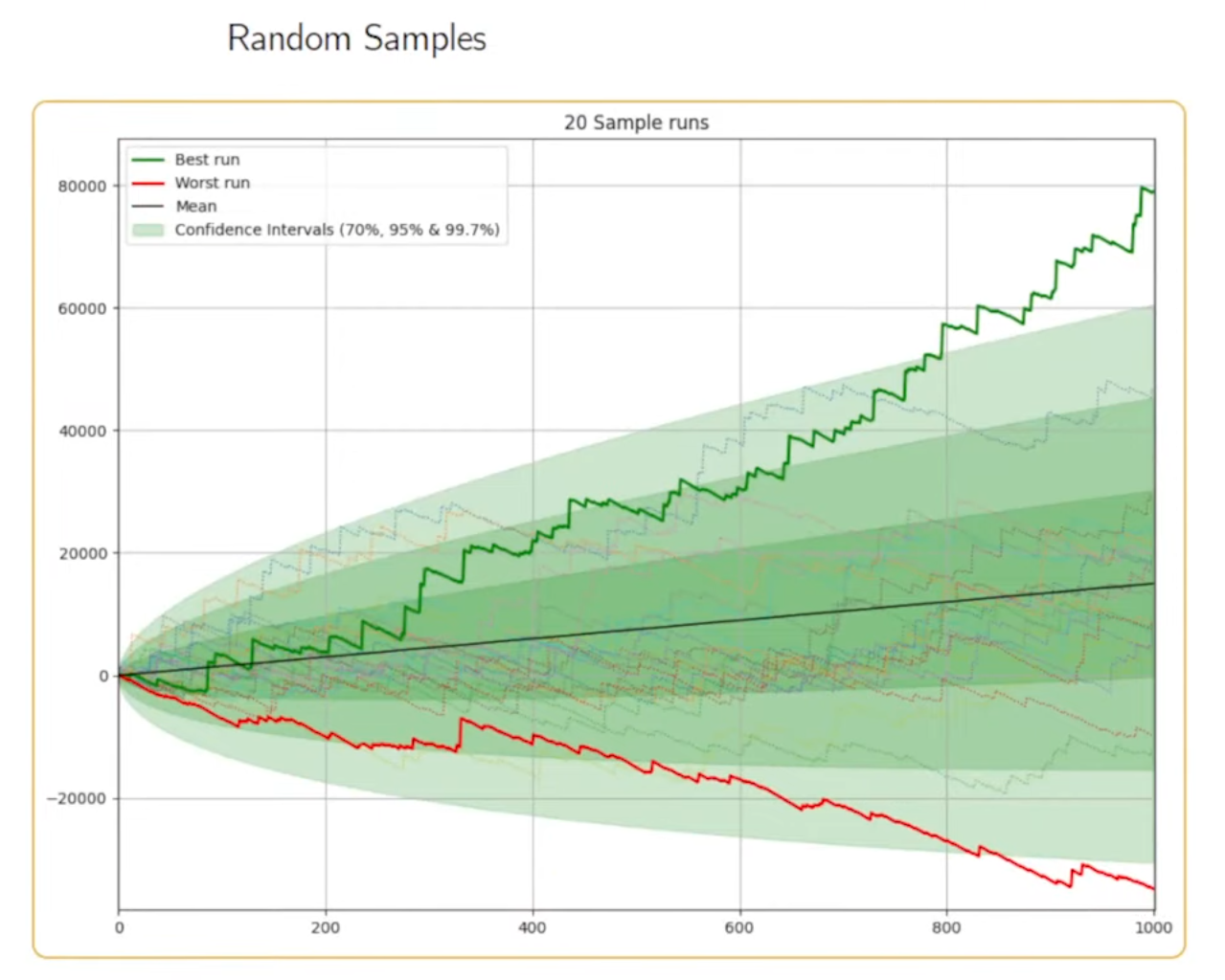 Он попросил калькулятор просчитать 10,000 вероятных исходов с учётом дисперсии и определил стартовый банкролл в $20,000. С учётом перечисленных параметров калькулятор выдал ему итог из 20 случайных сэмплов расчётов, в том числе самый худший и самый лучший на 10,000 расчётов: