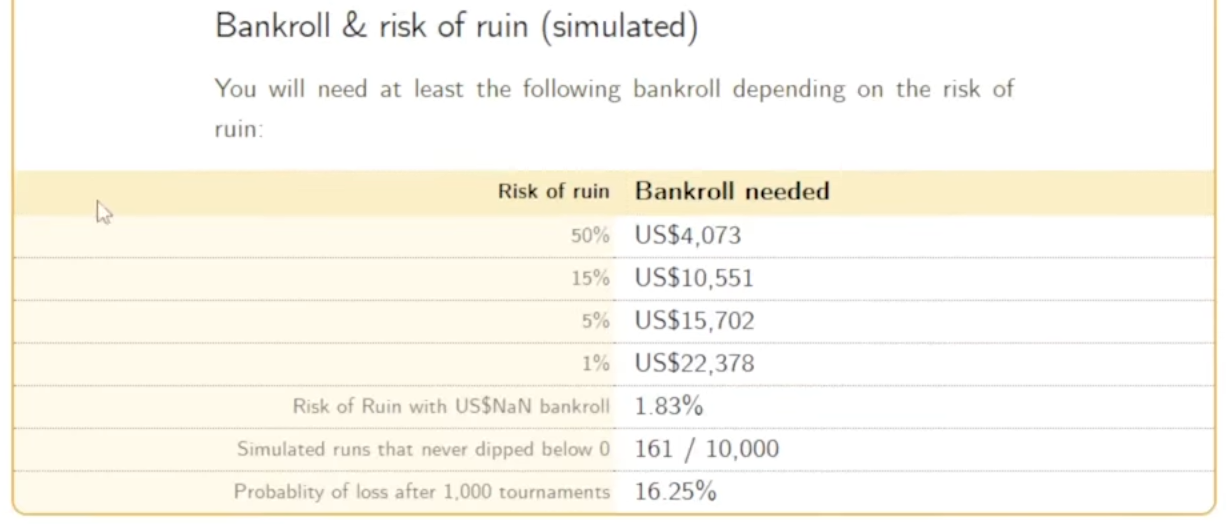 По ним можно увидеть, какой банкролл для выбранных турниров будет иметь наивысший риск потери всех средств, а также насколько высок риск потери всего банкролла по заданным параметрам — всего 1.83%.